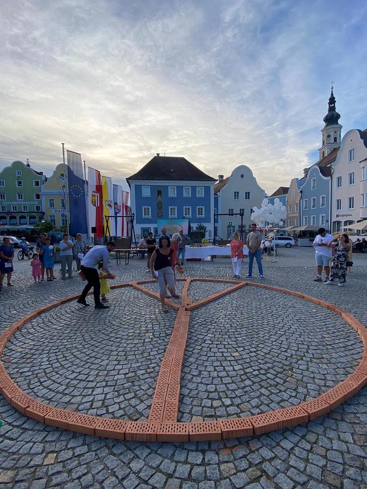 Danach wurden die Teilnehmer*innen eingeladen, selbst Hand anzulegen und mit Ziegelsteinen ein großen Friedenszeichen auf den Boden zu legen. Den Abschluss bildete ein Luftballonstart, der Friedensbotschaften in die Weite trug.